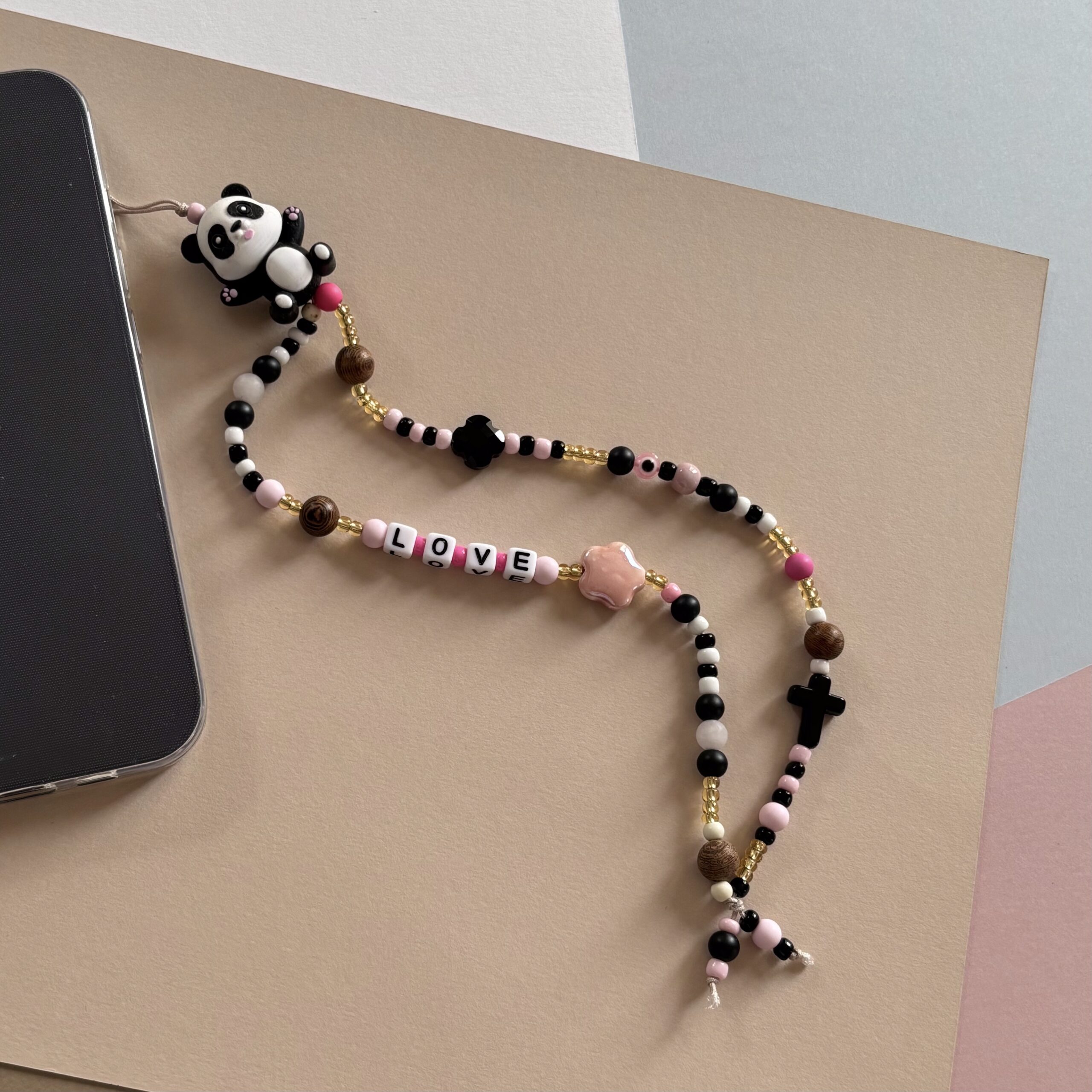 Lanière de téléphone portable en perles – longueur 28cm. Pièce unique.